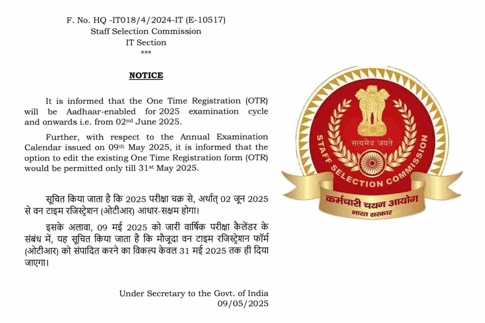 The Staff Selection Commission (SSC) has launched a new One Time Registration (OTR) system on its website ssc.gov.in starting from 02 June 2025. This free registration is mandatory for all future SSC recruitment exams. Candidates need to provide basic personal and educational details to complete the OTR process, which simplifies future applications. Sarkari result